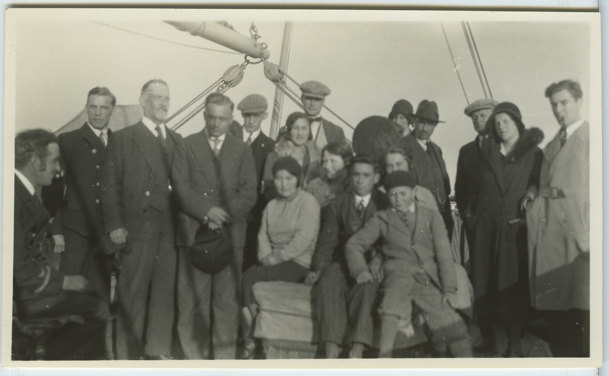 'Passagerare från ''Hans Egedr'' under avresan till Vesö-Grönland. På bilden syns 17 personer, äldre och yngre, kvinnor och män. :: Står omnämt i Frits Johansens dagbok att han tog fotografi på passagerare. Kläder. Klädsel. :: :: Enligt kuvertet som negativet låg i ''Trip to W-Greenland XIII''. :: :: Ingår i serie Fotonr. 5217:1-103. Se även hela fotonr. 5202-5218 med bilder från Frits Johansen.'