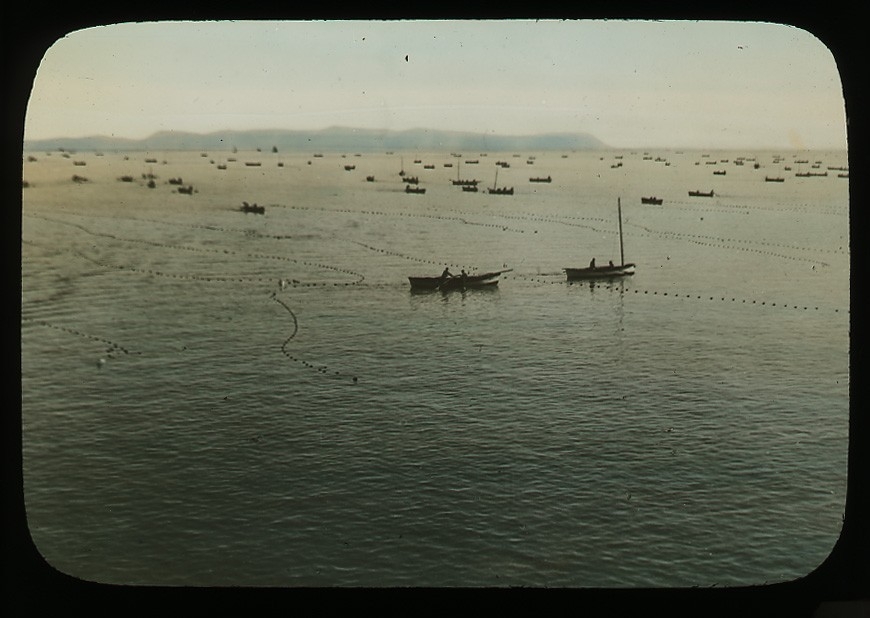 'Hel fiskeflotta till havs med nät utlagda för laxfiske i flod. Spridda småbåtar. Text på glaset: ''Salmon flut at mouth of Trasch River.'' :: :: Ingår i serie med fotonr. 5205:1-20. Se även hela fotonr. 5202-5218 med bilder från Frits Johansen.'