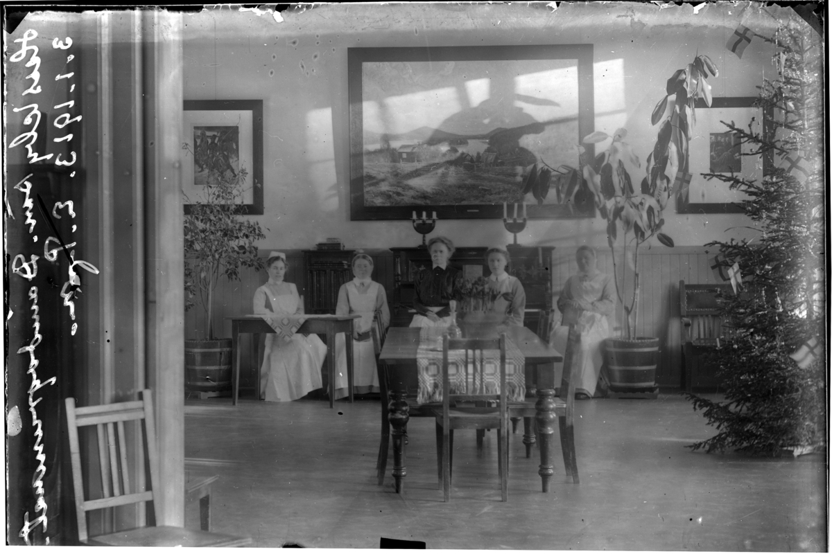 'Bildtext: ''Hessleby sanatorim. Damdagrummet.'' :: 5 kvinnor sittande i soffa i ett rum. Interiör med möbler, bord, stolar, soffa, krukväxter, tavlor, julgran, ljusstakar, piano. Sjukvårdskläder. :: :: Ingår i serie med fotonr. 5140:1-39.'