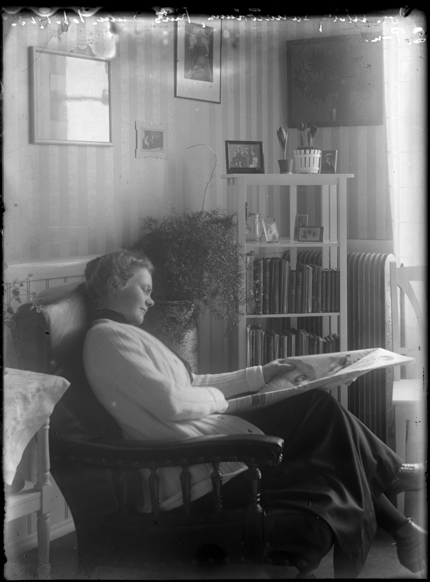 'Bildtext: ''Hesselby sanatorium. Ruts rum.'' 1 kvinna sitter i en fåtölj eller gungstol och läser tidningen. I rummet, hylla med böcker, almanackor med årtal, fotografier i ramar, porträtt, tavlor, krukväxt stående på piedestal av björkstam. :: :: Ingår i serie med fotonr. 5140:1-39.'
