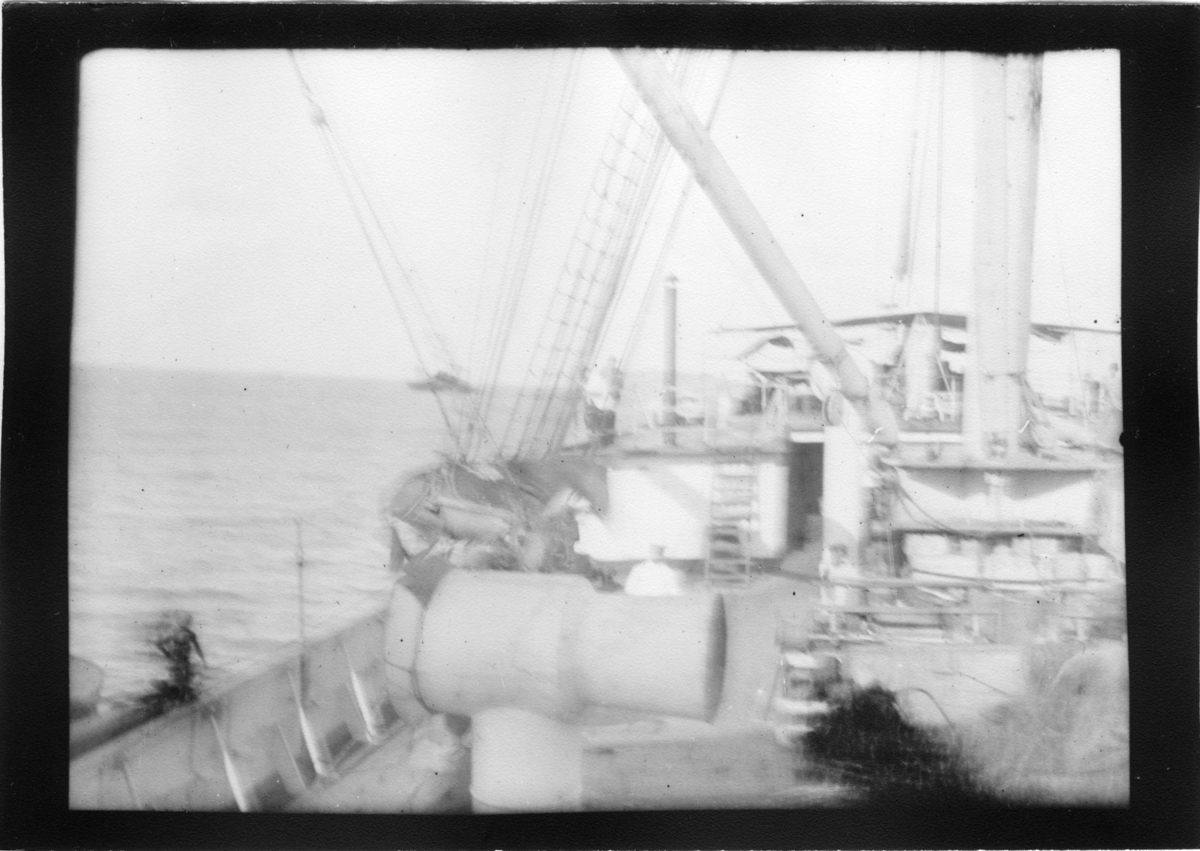 'Diverse fotografier från bl.a. dåvarande Nordrhodesia, nu Zambia, tagna av Konsul Magnus Leijer. :: :: Ett suddigt fotografi från däcket på en båt. Med vatten synligt i bakgrunden.'