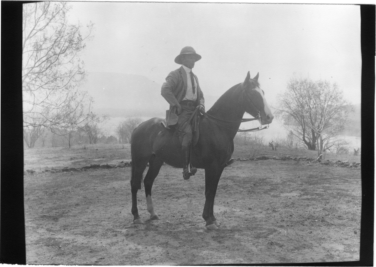 'Diverse fotografier från bl.a. dåvarande Nordrhodesia, nu Zambia, tagna av Konsul Magnus Leijer. :: :: En man sittande på en häst, fotograferad från nära håll från sidan. I bakgrunden är mindre träd, berg och vatten synligt.'