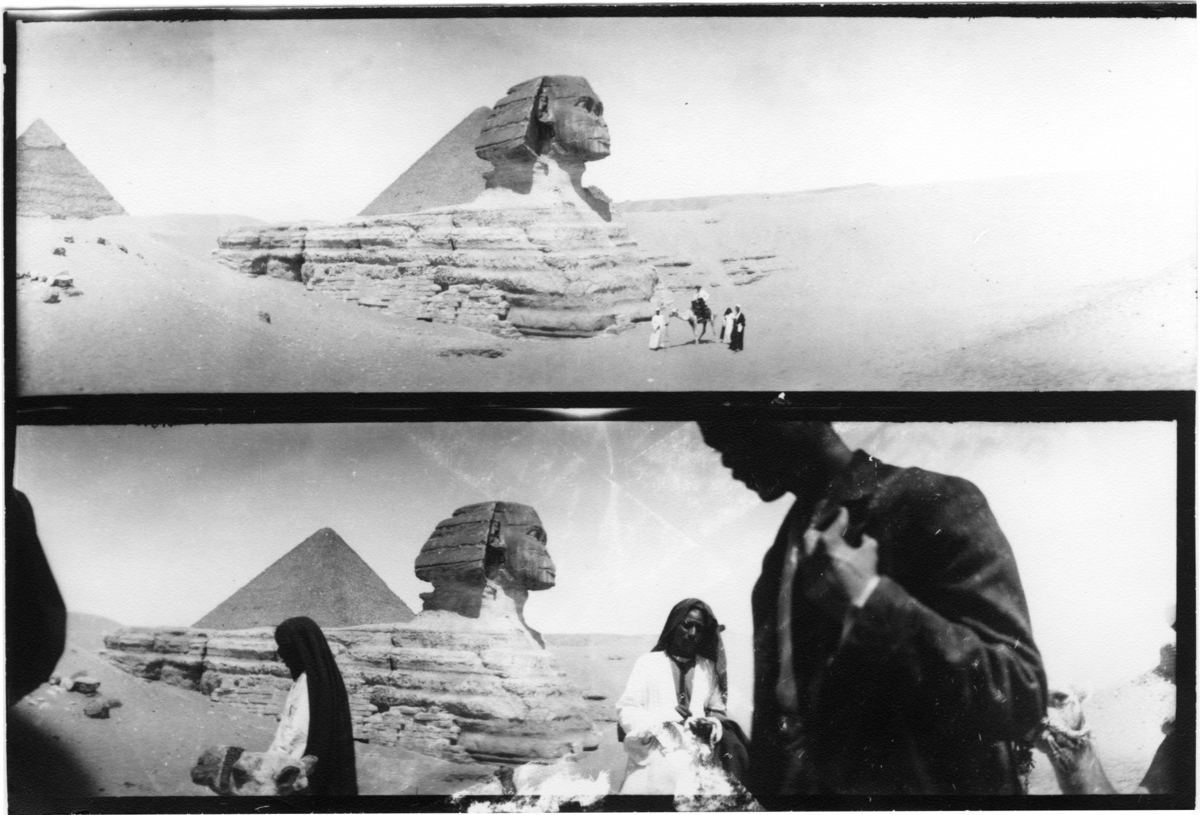 'Diverse fotografier från bl.a. dåvarande Nordrhodesia, nu Zambia, tagna av Konsul Magnus Leijer. :: :: 2 foton på samma kopia: båda föreställande ett sällskap på fyra personer och en dromedar (?) i sanden framför en sfinx. En närbild, en från avstånd.'