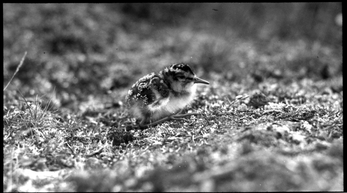 'Bildtext: ''Kärrsnäppa, unge.'' Kärrsnäppa, unge, liggande på lavklädd mark, närbild. :: :: Ingår i serie med fotonr. 5160:1-9, se även hela serien fotonr. 5155-5162.'