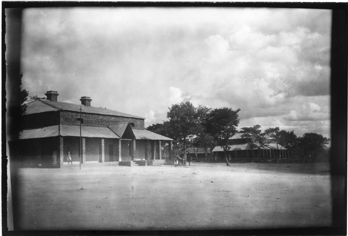 'Diverse fotografier från bl.a. dåvarande Nordrhodesia, nu Zambia, tagna av Konsul Magnus Leijer. :: :: 2 större byggnader fotograferade från avstånd. Framför den närmre är ett fåtal människor synliga. I förgrunden, sandplan.'