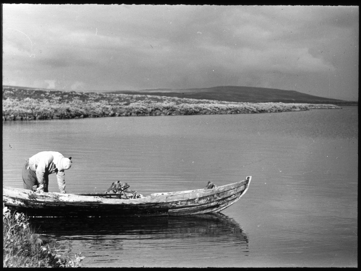 'Bildtext: ''Strandparti v. Tjålmejaure.'' Vy över sjön, i förgrunden 1 hattklädd person i en eka invid strandkanten. I ekan åra och packning, väska. :: :: Ingår i serie med fotonr. 5165:1-7, numrerade med bildnr 216-222.'