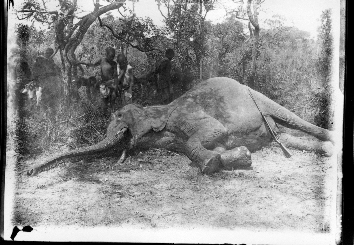 'Diverse fotografier från bl.a. dåvarande Nordrhodesia, nu Zambia, tagna av Konsul Magnus Leijer. :: :: En fälld elefantunge liggande på marken med ett gevär lutat mot kroppen. Bakom står 2 pojkar vid ett träd, bakom dem är ytterligare personer synliga.'