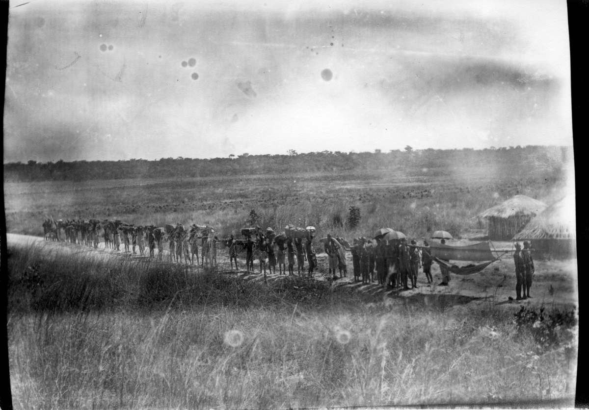 'Diverse fotografier från bl.a. dåvarande Nordrhodesia, nu Zambia, tagna av Konsul Magnus Leijer. :: :: 1 stor grupp människor bärande på packning på en grusväg, i bakgrunden är 2 hyddor synliga.'