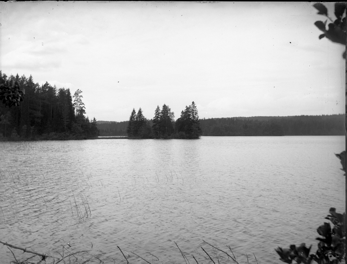 'Vy med sjö och granskog. :: På asken som plåtarna ligger i står det att det ska finnas bilder från, Timmertjärnet, Trolldalen, Vid Bålnäs och Sågtjärnet. Dessa bildtexter hör till fotonr. 5229:8-13. Vilken som är vilken oklart. :: :: Ingår i serie med fotonr. 5229:1-13.'
