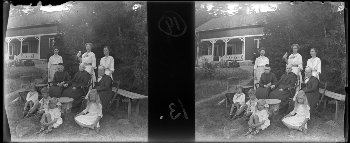 'Bildtext: ''Lofthus: Georgiis and Insulanders, group.'' (Gruppen med Insulander och Georgiis) :: Gruppbild med 6 kvinnor, varav 3 äldre och 4 barn, 2 flickor och 2 pojkar. Samlade sittande och stående vid trämöblemang, utemöbler i trä där bortdet består av stubbe och bräder ovanpå. 1 av kvinnorna håller en slags papegoj-fågel. I bakgrunden granar och villan med veranda och framför trädgårdsväxter. :: :: Ingår i serie med fotonr. 5249:1-20, se även hela serien med fotonr. 5237-5267.'