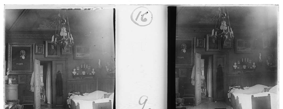 'Interieör i Hilda Lindgrens studio med takkrona, tavlor, stolar, bord, byster, ljusstake. Enligt text till fotot: ''Hilda Lindgren´s studio.'' :: :: Ingår i serie med fotonr. 5245:1-20, se även hela serien med fotonr. 5237-5267.'
