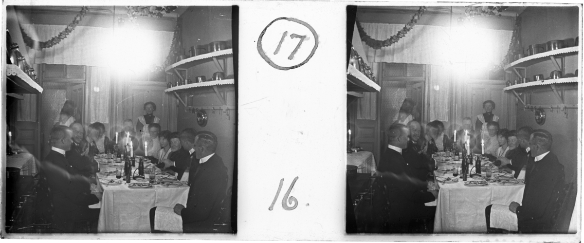 'Bildtext: ''Nyårsafton i Karl Leijers kök.'' :: 12 personer, kvinnor och män, samlade vid dukat bord. På bordet tallrickar, bestick, drickasgal, glasflaskor, ljusstakar, 1 hushållerska stående intill bordet. Ev. ett barn i bakgrunden. På väggen hylla med grytor och lock, med hyllbård. Kläder. :: :: Ingår i serie med fotonr. 5252:1-17, se även hela serien med fotonr. 5237-5267.'