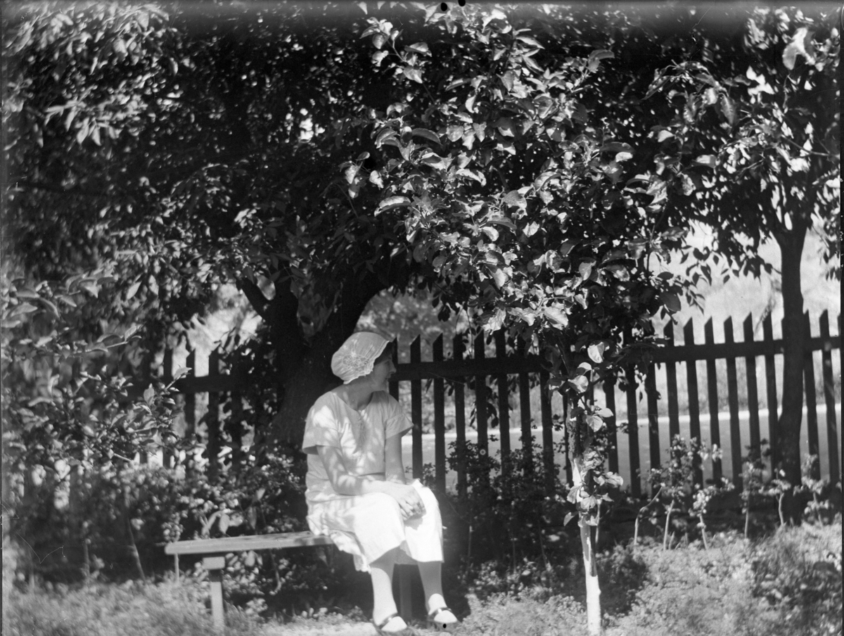 'Vy med 1 kvinna sitttande på en träbänk i en trädgård, framför trästaket. :: :: Ingår i serie med fotonr. 5233:1-14'