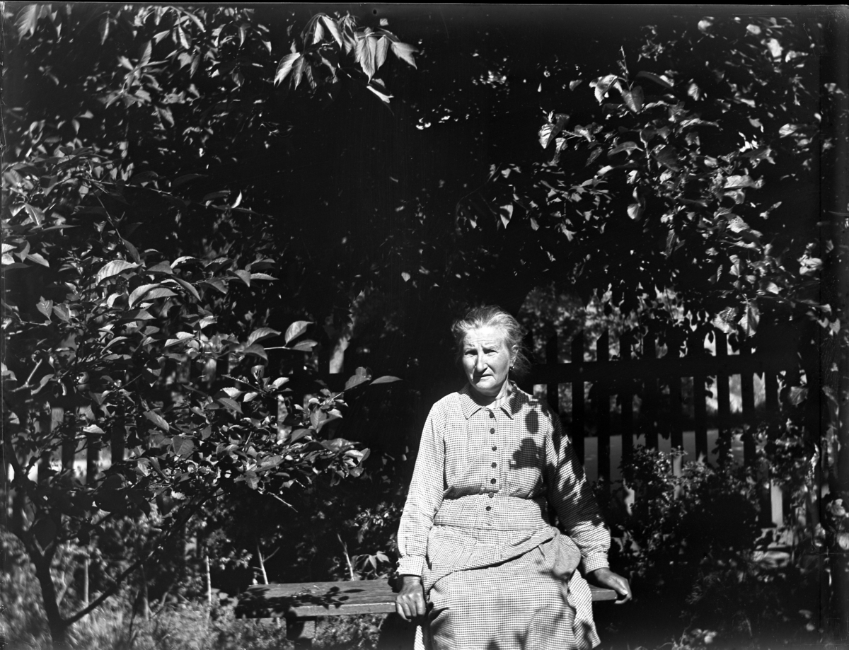 'Bildtext: ''Kyrkesund 1927.'' :: 1 kvinna sittande på en träbänk i en trädgård, i bakgrunden ett trästaket. :: :: Ingår i serie med fotonr. 5233:1-14'