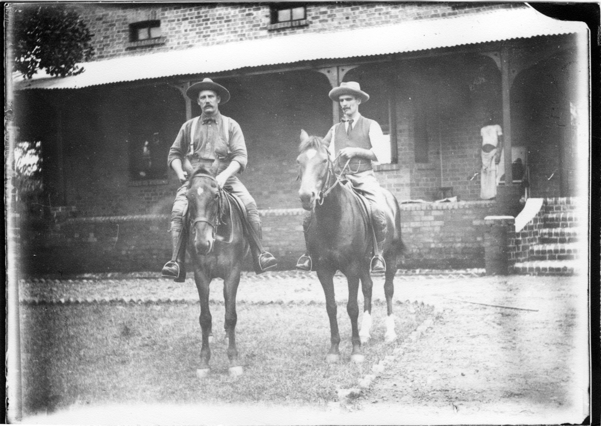 'Diverse fotografier från bl.a. dåvarande Nordrhodesia, nu Zambia, tagna av Konsul Magnus Leijer. :: :: 2 st män på en varsin häst, fotograferade framfifrån. Bakom dem på verandan till ett tegelhus står 1 st man.'