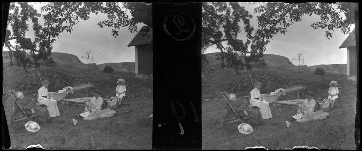 'Bildtext: ''Familjegrupp vid Sävö gård.'' :: Grupp med 3 kvinnor, varav 1 äldre, 1 flicka (barn) och 1 bebis, sittande i gräset samt på trästolar. På bilden även papegojfågel i gräset, dockvagn med docka, barnvagn, filtar, trästol, pinnastol. Gavel på hus synlig. Kläder. :: :: Ingår i serie med fotonr. 5255:1-18, se även hela serien med fotonr. 5237-5267.'