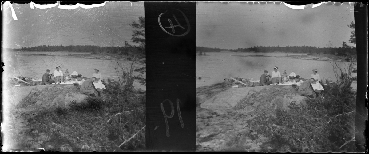 'Bildtext: ''Skärjorna, med Charlestons och J.E.F.'' :: Grupp, 4 vuxna, män och kvinnor och 2 barn, sittande på berghäll vid vattnet. Med picknickkorgar och uppdukad picknickmat samt glas och flaskor framför sig. I bakgrunden havet och skär. :: :: Ingår i serie med fotonr. 5255:1-18, se även hela serien med fotonr. 5237-5267.'
