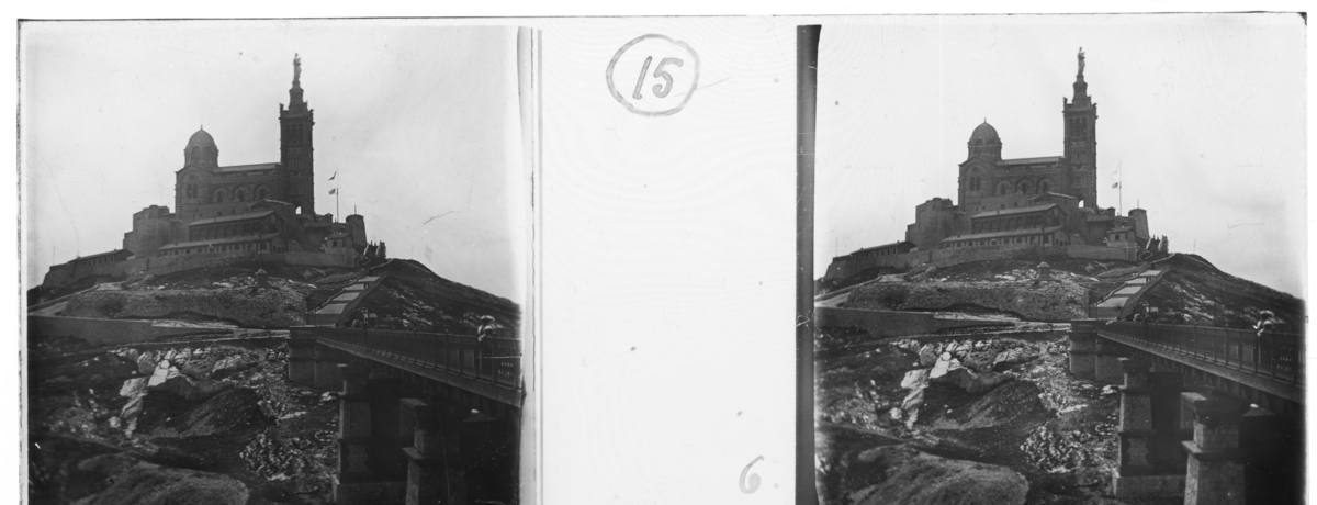 'Vy upp mot kyrkan Notre Dame de la Garde liggande på ett berg. :: Enligt text till fotot: ''Notre Dame de la Garde.'' :: :: Ingår i serie med fotonr. 5242:1-17, se även hela serien med fotonr. 5237-5267.'