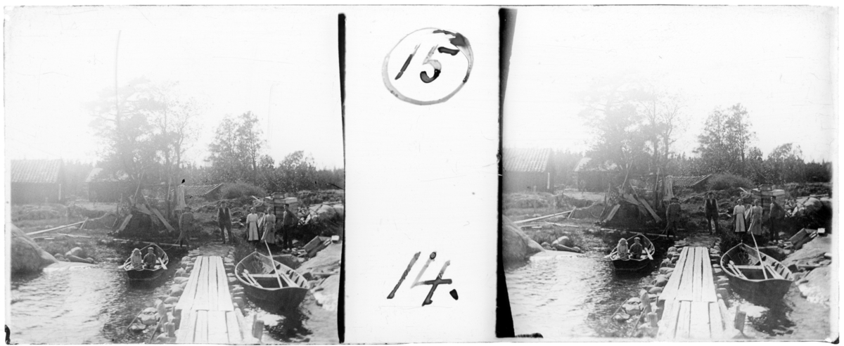 'Bildtext: ''Båtsvik, from landing stage.'' (Båtsvik sett från landningsstället) :: Människor vid landningsställe för båtar, 2 ekor, båtar, invid brygga, på land står 3 män, 2 kvinnor och i en av båtarna sitter 2 barn. I bakgrunden syns trave med trälådor och ett hus. :: :: Ingår i serie med fotonr. 5250:1-21, se även hela serien med fotonr. 5237-5267.'