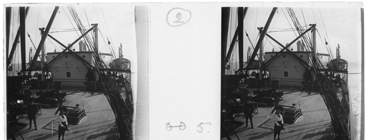 'Del av båtdäck, människor synliga. :: Enligt text till fotot: ''Main deck, 2nd class promenade.'' (Huvuddäck, 2:a klass promenad.) :: :: Ingår i en serie med fotonr. 5241:1-18. Se även fotonr. 5237:1-16, 5238:1-18 och 5239:1-18, 5240:1-17.'