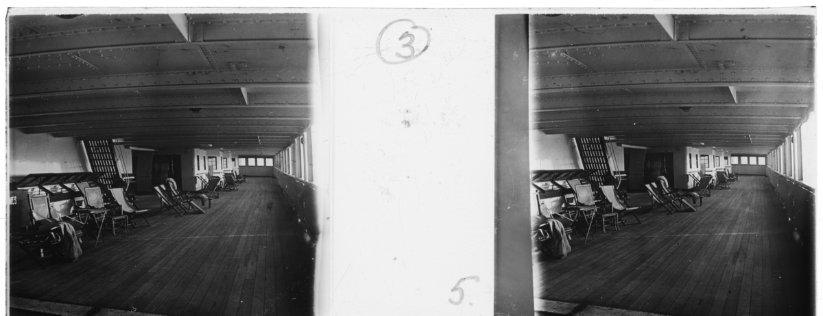 'Del av promenaddäck med tak över, solstolar uppradade. :: Enligt text till fotot: ''Promenade deck, 1st class.'' (Promenaddäck, 1:a klass.) :: :: Ingår i en serie med fotonr. 5241:1-18. Se även fotonr. 5237:1-16, 5238:1-18 och 5239:1-18, 5240:1-17.'