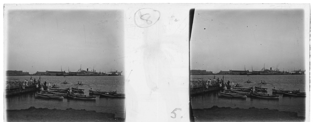 'Vy med knappt 10 småbåtar med människor invid brygga med personer på. Vy med byggnader och större båt på avstånd. :: Enligt text till fotot: ''At Port Sudan.'' (Vid Port Sudan.) :: :: Ingår i en serie med fotonr. 5241:1-18. Se även fotonr. 5237:1-16, 5238:1-18 och 5239:1-18, 5240:1-17.'