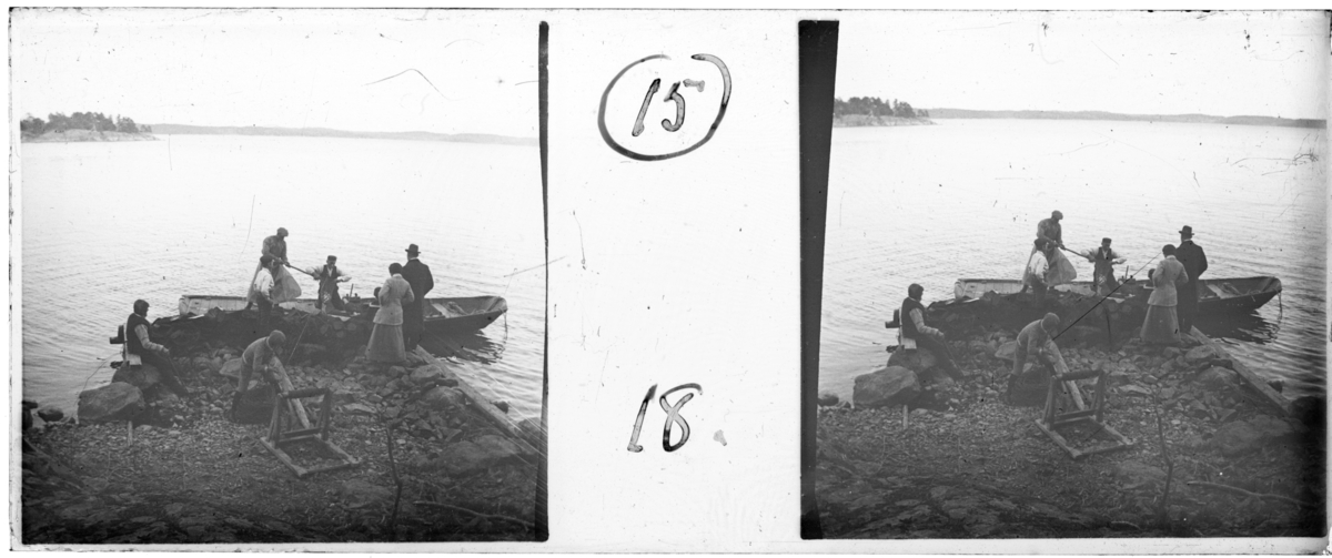 'Bildtext: ''Strömmingsvarp, Fru Möller och J.E. Frykberg.'' :: Vy med 7 personer samlade nere vid vattnet, kvinna, män, barn. Vid en eka, träbåt, i arbete med fiskenät. Kläder. :: :: Ingår i serie med fotonr. 5254, se även hela serien med fotonr. 5237-5267.'