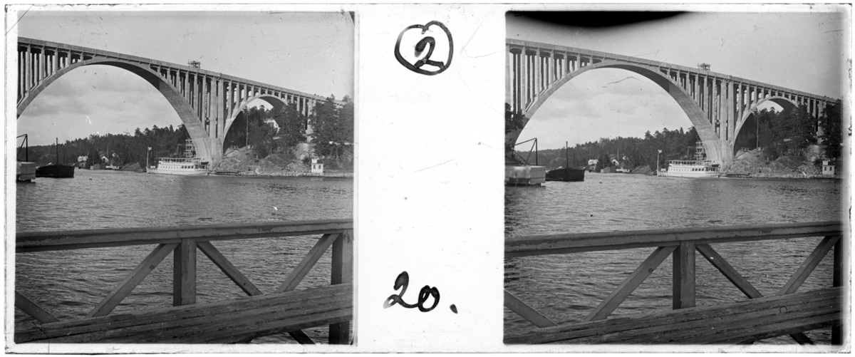 'Bildtext: ''Skuru bro, färdig.'' :: Vy med Skurubron, sedd från mindre träbro. På avstånd båt och hus. :: :: Ingår i serie med fotonr. 5256:1-18, se även hela serien med fotonr. 5237-5267.'