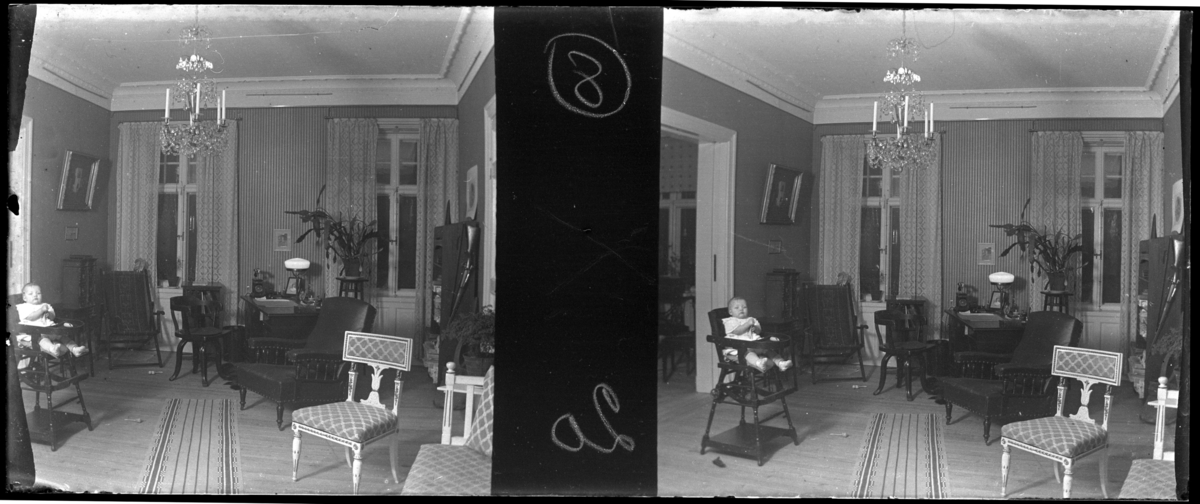 'Bildtext: ''Vardagsrummet, med Magnhild.'' :: 1 barn, bebis, sittande i barnstol i ett rum med matta, tavla, gardiner, stolar, fåtöljer, krukväxter, skrivbord, blompiedestal, fotoram, telefon, leksak, skallra på golvet. Kläder. Möbler. :: :: Ingår i serie med fotonr. 5256:1-18, se även hela serien med fotonr. 5237-5267.'