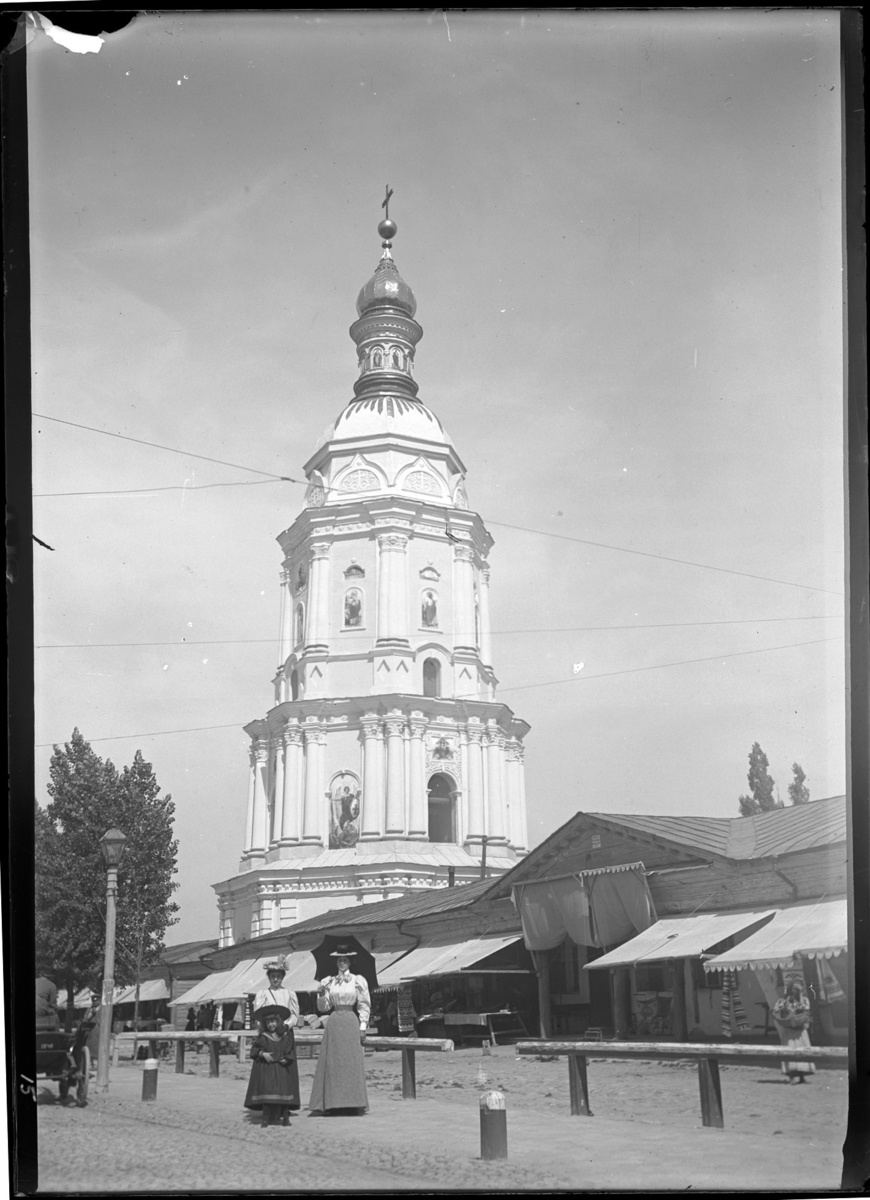 'Gatuvy framför kyrka med målningar på utsidan. Nedanför står 2 kvinnor och 1 flicka. :: :: Ingår i serie med fotonr. 5274:1-22. Se även fotonr. 5269-5292 med bilder från Stuxbergs resa till Kaukasien.'
