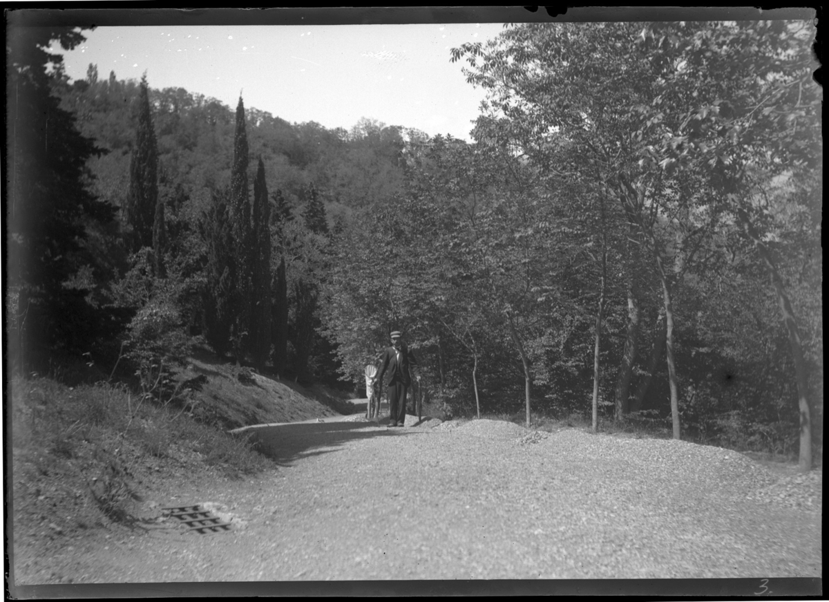 '1 man gående på grusväg med träd på sidorna. Mannen bär en håv och är iklädd käpp. Kläder. Klädsel. :: :: Ingår i serie med fotonr. 5282:1-15. Se även fotonr. 5269-5292 med bilder från Stuxbergs resa till Kaukasien.'
