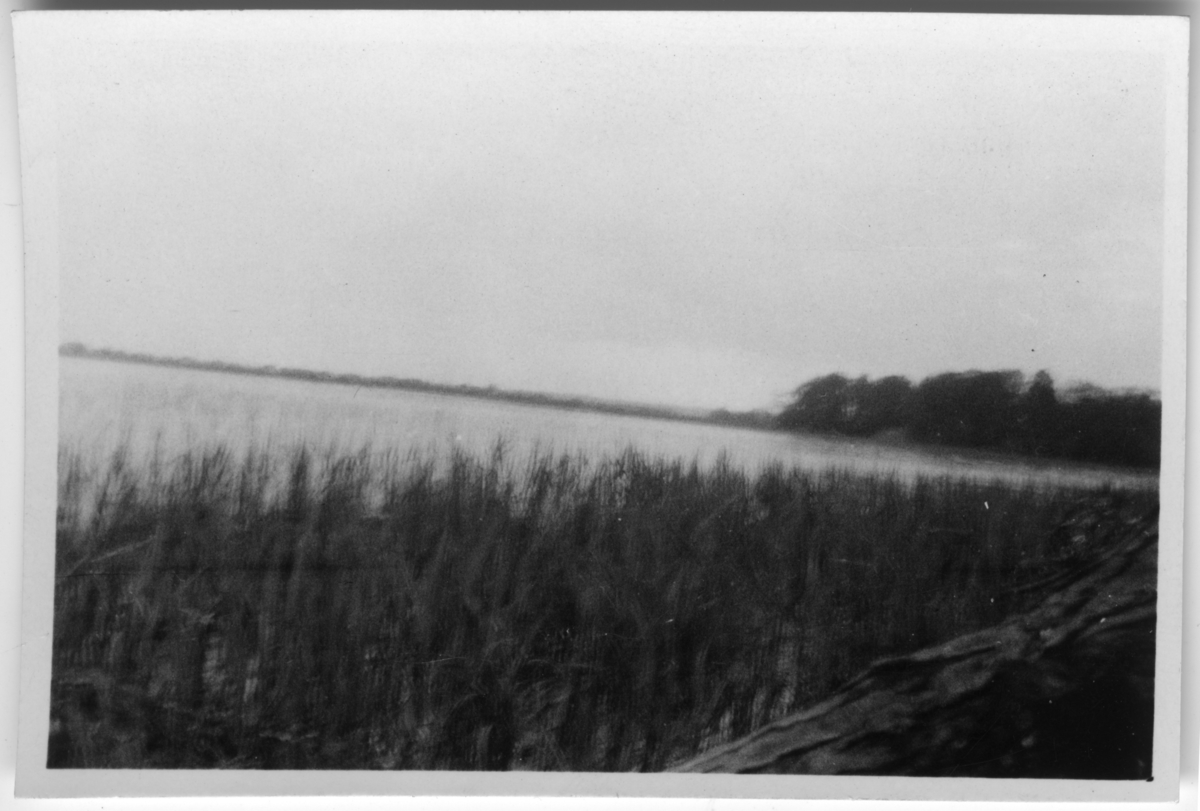 'Bildtext: ''I bakgrunden västra stranden. Kortet taget från östra stranden. :: :: Vy över sjön, med vassvegetation i förgrunden, suddig bild. :: :: Ingår i serie med fotonr. 7089:1-15'
