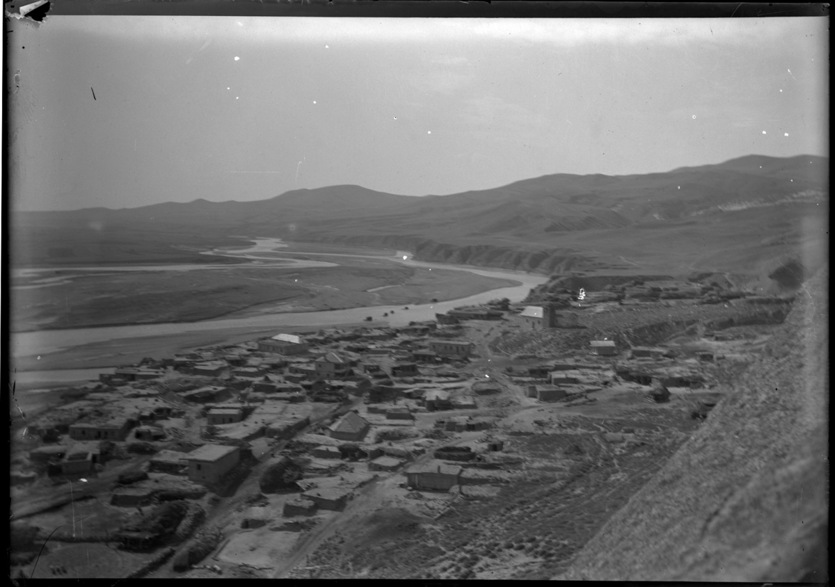 'Vy över ev. flod med intilliggande hus omgivna av berg. :: :: Ingår i serie med fotonr. 5279:1-16. Se även fotonr. 5269-5292 med bilder från Stuxbergs resa till Kaukasien.'