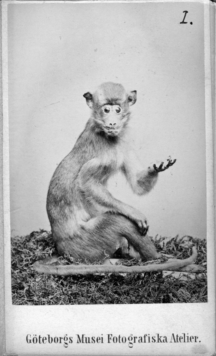 '1 monterad makak. :: :: Text till bilden: ''Makaken är allämn i Ostindien och tillfogar plantagegarna stor skada. Hon är särdeles läraktig och en utmärkt mimiker samt underhålles derföre ofta i menagerier. Man har till och med sett henne på en landtgård löpa fritt omkring och ridande åtfölja boskapen på bete, men då gårdsklockan ljöd, hoppade den lilla ryttaren ned och lunkade mot hemmet.'' /August Wilhelm Malm år 1866. :: :: Serie med fotonr. 7079:1-37. Fotografierna är monterade i en liten bok, inbunden, med titel ''Fotografier öfer Däggdjur och foglar. Texter av A. W (1866). Malm. Boken återfinns i Göteborgs Naturhistoriska Museums bibliotekssamling under ''Äldretryck''. På baksidan av varje foto finns en text om arten. :: :: Se även fotonr. 5693:1-4.'
