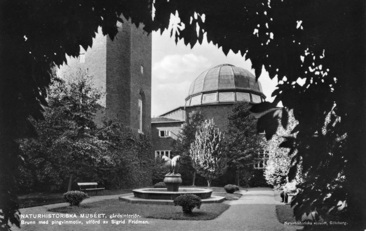 'Ingår i en serie med Fotonr. 5419 med Göteborgs Naturhistoriska museums olika vykort genom åren. :: :: Vy över Göteborgs Naturhistoriska museums innergårdsinteriör. I mitten syns springbrunnen, fontänen, med pingvinmotiv av Sigrid Fridman. Vy mot dioramatornet. :: :: Se fotonr. 4070 för ursprungligt foto.'