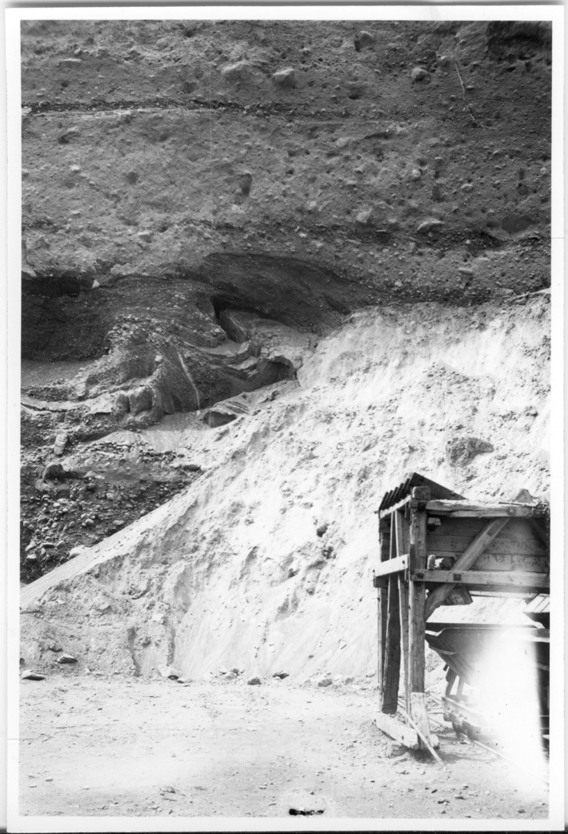 'Bildtext: ''Dösebacka.'' Närbild på del av vägg i grustaget och redskap i träkonstruktion. :: :: Ingår i serie med fotonr. 7058:1-32.'