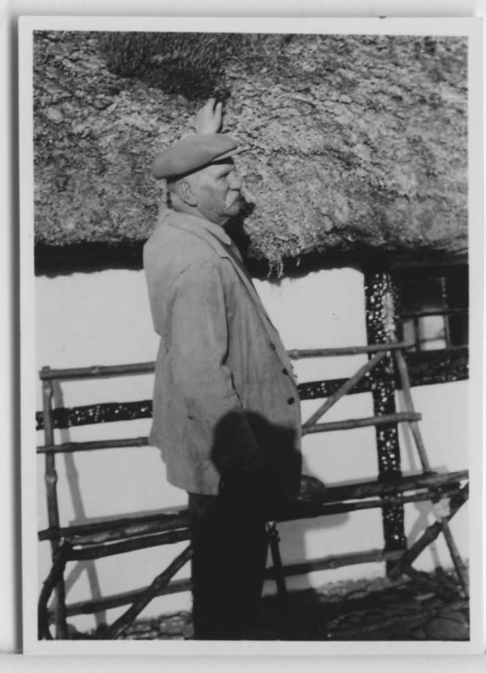 'Biologiska föreningens utfärd till Läsö och Nordre Rönner: :: :: ''Bangsbo gård, Läckö.'' Närbild på 1 st man vid husvägg, med handen på taket. 1 bänk invid väggen. :: :: Se fotonr. 2674-2734, 2687-2691, 2692-2711, 2714-2734, 2843-2863 och 2975 från samma utfärd.'