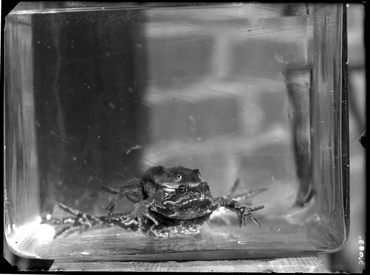 'Vanlig groda under parning i labb. Sedda framifrån. :: :: Se serie med fotonr. 3082-3090.'