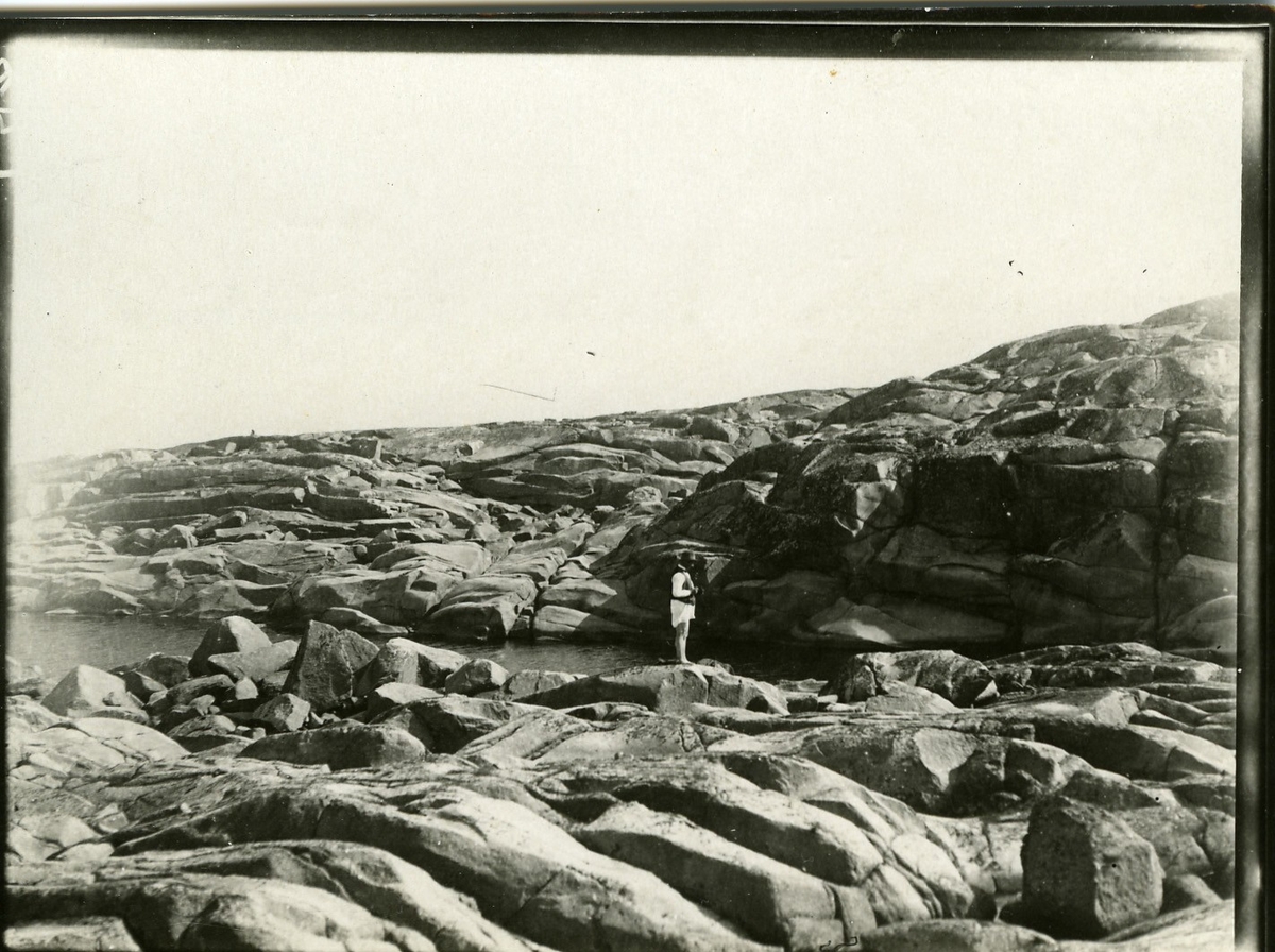 Lunnefåglarnas häckplats. En man i skjorta och väst med på bilden. Berghällar.