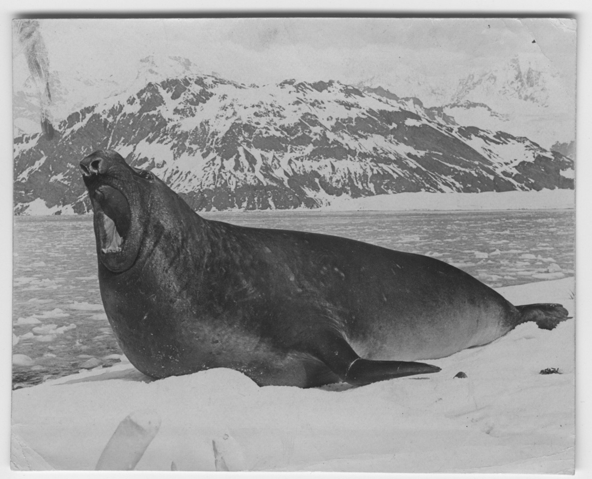 'Gäspande sjöelefant liggande på snö med berg i bakgrunden. Närbild. :: :: Ingår i serie med fotonr. 1170-1173.'