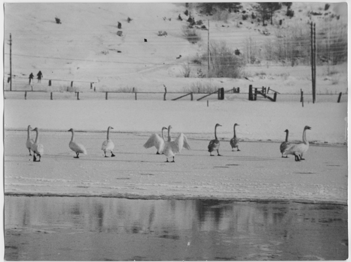 '10 svanar på isen vid Bohus. I bakgrunden staket, elledning och människor i en sluttning. Snöklädd mark. :: :: Ingår i serie med fotonr. 1373-1379.'