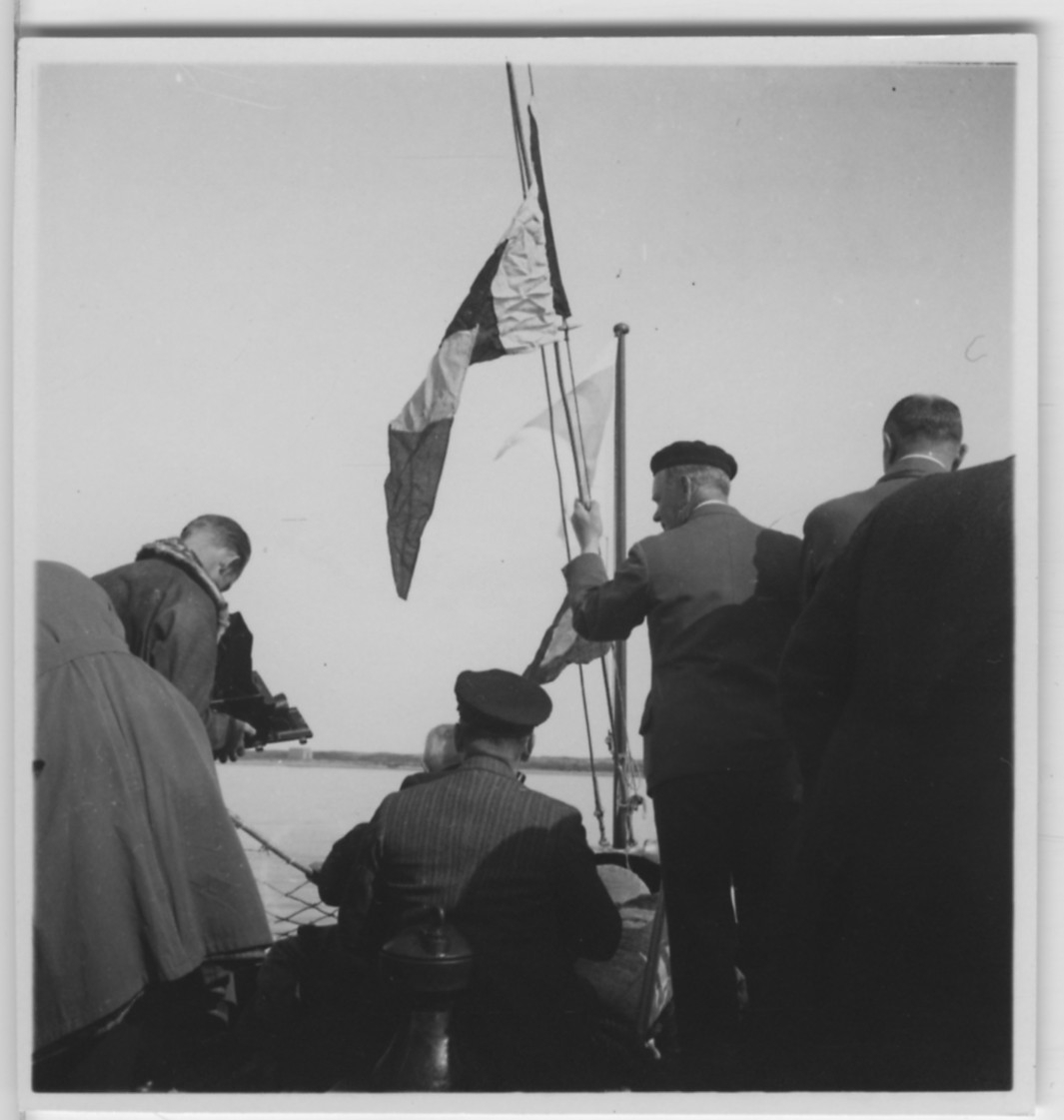 'Biologiska föreningens utfärd till Läsö och Nordre Rönner: :: :: ''Båtens skugga på havsbotten''. Ryggen på ca 6 st män som står vid relingen och tittar ner i vattnet. Flagga. :: :: Se fotonr. 2674-2734, 2687-2691, 2692-2711, 2714-2734, 2843-2863 och 2975 från samma utfärd.'