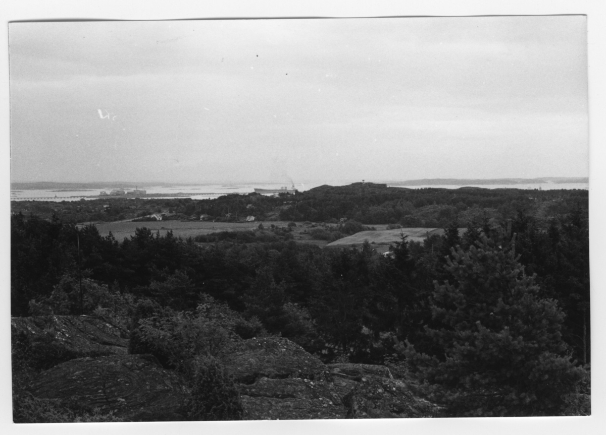 'Bildtext: ''Äng i hällparti. Riktning 160.'' Vy över öppna ängspartier med omgivande barrträdsvegetation. Hus ner mot havet och stora båtar i vattnet. Hamn, brygga/pir. :: :: Ingår i serie med fotonr. 6970:1-1125, dokumentation av Hisingens naturgeografi, visande landskapsformerna i stora drag och gjord inför exploateringen av området. Platserna för fotograferingen finns utsatta på karta i skala 1:4000 som finns på Göteborgs Naturhistoriska musem. Fotoriktningen mättes med kompass i gammalgrader.'