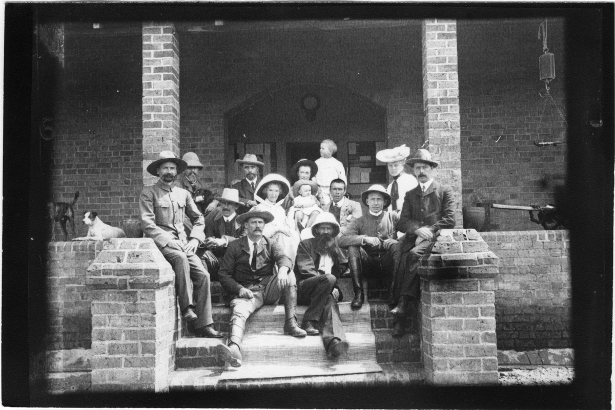 'Diverse fotografier från bl.a. dåvarande Nordrhodesia, nu Zambia, tagna av Konsul Magnus Leijer. :: :: 9 män, 3 kvinnor, 2 barn och 3 hundar sittandes på trappan till en tegelbyggnad.'