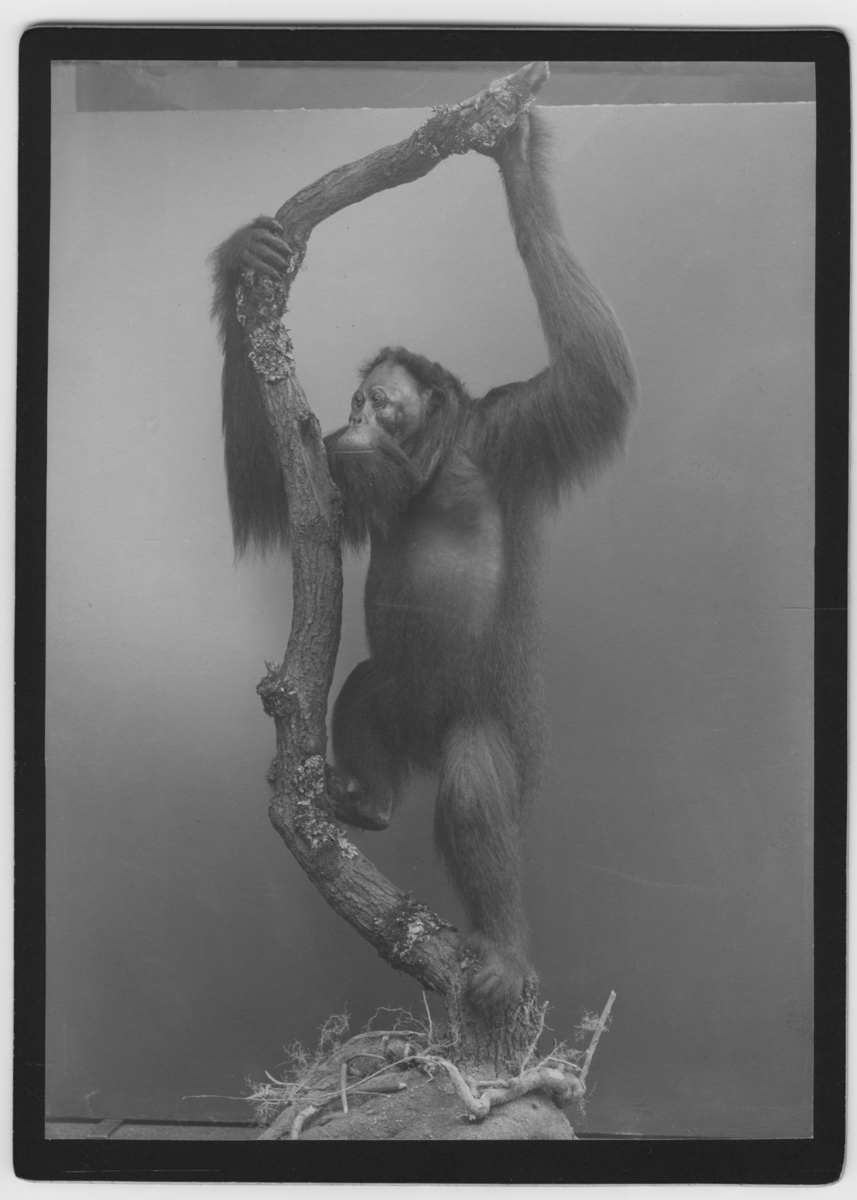 'Orangutang monterad stående i ett träd. :: :: Orangutangen finns utställd i däggdjurssalen i monterskåp nr. 35 på Göteborgs Naturhistoriska Museum. :: :: Ingår i serie med fotonr. 226-229.'