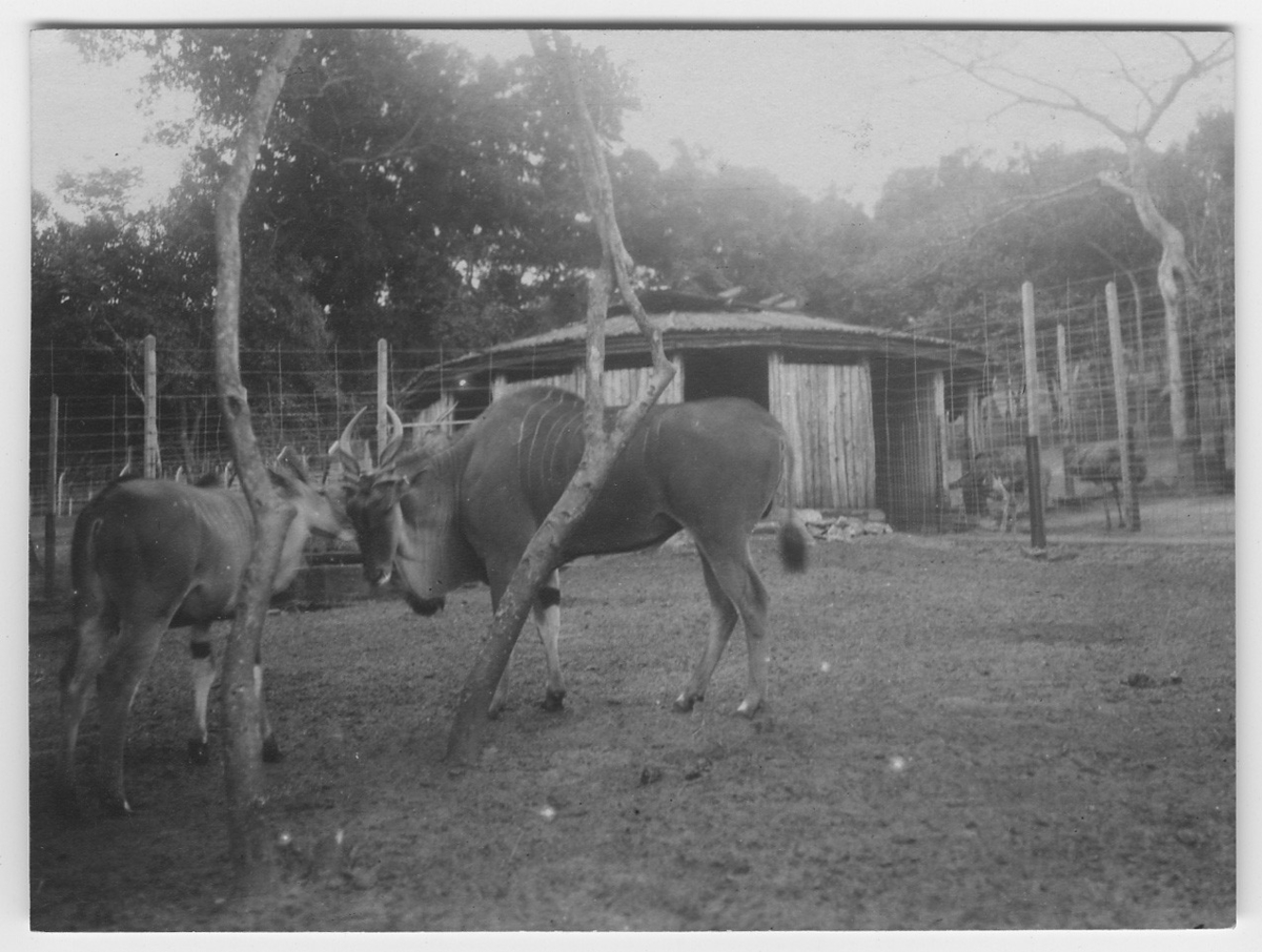 'Antiloper i hägn, träskjul och staket. I bakgrunden ev. strutsar. :: :: Ingår i serie med fotonr.167-179, 181-184, 186-191, 193-196, 198-203 samt 205-215 med foton från Hilmer Skoogs expedition till Sydafrika år 1912-1913.'