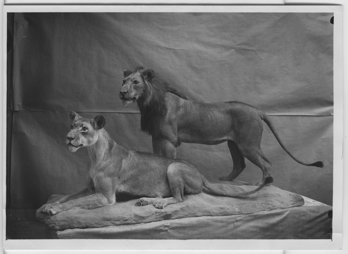 'Afrikanska lejon, liggande hona och stående hane. Sedda från sidan. Monterade av konservator David Sjölander. :: :: Hona: Ma.ex. 688, gen.kat.nr. 11-1965, Coll. An. 4652 :: Hane: Ma.ex. 1085, gen.kat.nr. 38-7260, Coll. An. 6928. Fynddatum: 1937-07-13. Fyndlokal: Manijara-sjön, Tanganyika provinsen . :: :: Lejonen står utställda i monterskåp nr. 16 i däggdjurssalen på Göteborgs Naturhistoriska Museum (2007-11-01). :: :: Se fotonr 4131:1-3'