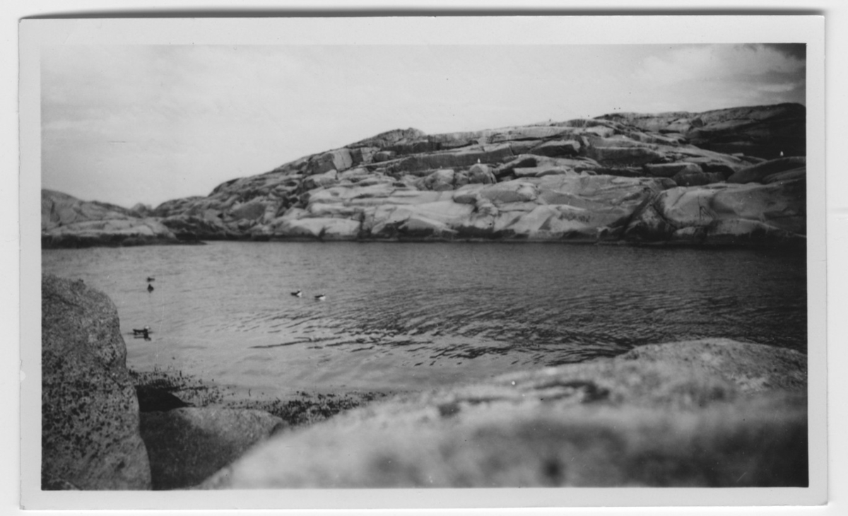 'Vy med berghällar och havet med simmande lunnefåglar. :: :: Text på baksidan av fotot: ''5 st lunnefåglar i Nordviken. Jag hade en gammal pressening som jag fick låna av Oscar Engelbrektson, Hunnebostrand, då jag tog fotografiet och fick vänta 1 timme innan dessa vågade simma tillbaka till sina bohål.'' :: :: Ingår i serie med fotonr. 4500:1-172.'