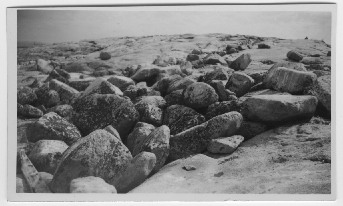 'Vy med stenblock på berghäll. :: :: Text på baksidan av fotot: ''Under detta stenrös ligger 6 st lunnefågelungar.'' :: :: Ingår i serie med fotonr. 4500:1-172.'