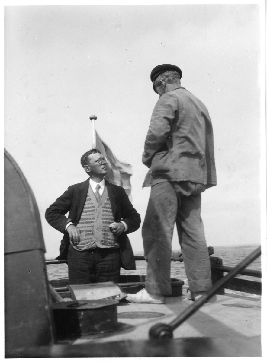 'Akka-expeditionen sommaren 1929: :: :: AdjunktAnders Wastensson / Anders Wastenson och räkfiskaren Johan Johansson på båten ''Akka'', :: närbild :: :: Ingår i serie med fotonr. 1599-1611.'